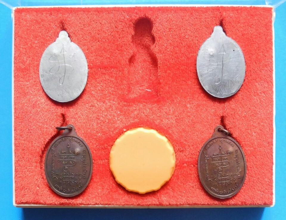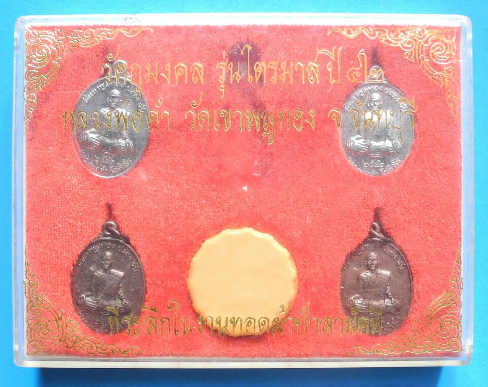 พระชุดหลวงพ่อดำ วัดเขาพูลทอง ปี42 ชุดกรรมการ มีเหรียญทองแดง 2 เหรียญ ตะกั่วหลังเรียบมีจาร 2 เหรียญ ตลับสีผึ้งมหาสเน่ห์ 1 ตลับ ขาดขวดน้ำมันไก่กุก พระชุดนี้หลวงปู่หมุนได้ปลุกเสกด้วยครับ |