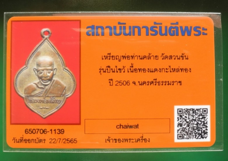 เหรียญพ่อท่านคล้าย วัดสวนขัน หลังปิดตาปืนไขว้ บล็อคผดน้อย พร้อมบัตรการันตีพระ